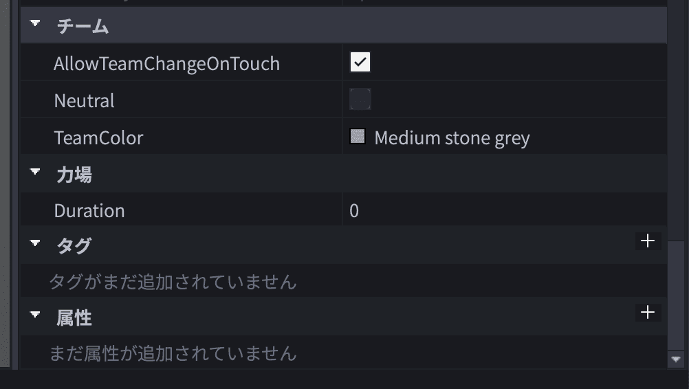 - プロパティにある「チーム」の項目を探し、「AllowTeamChangeOnTouch」のチェックをオン、「True」に。