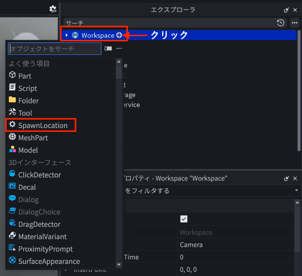 1. エクスプローラーから「WorkSpace」右側にある + ボタンをクリック。